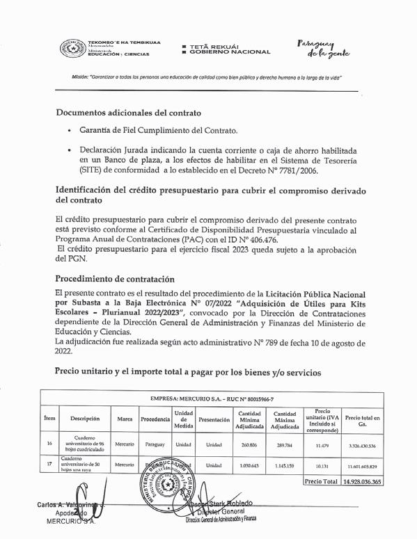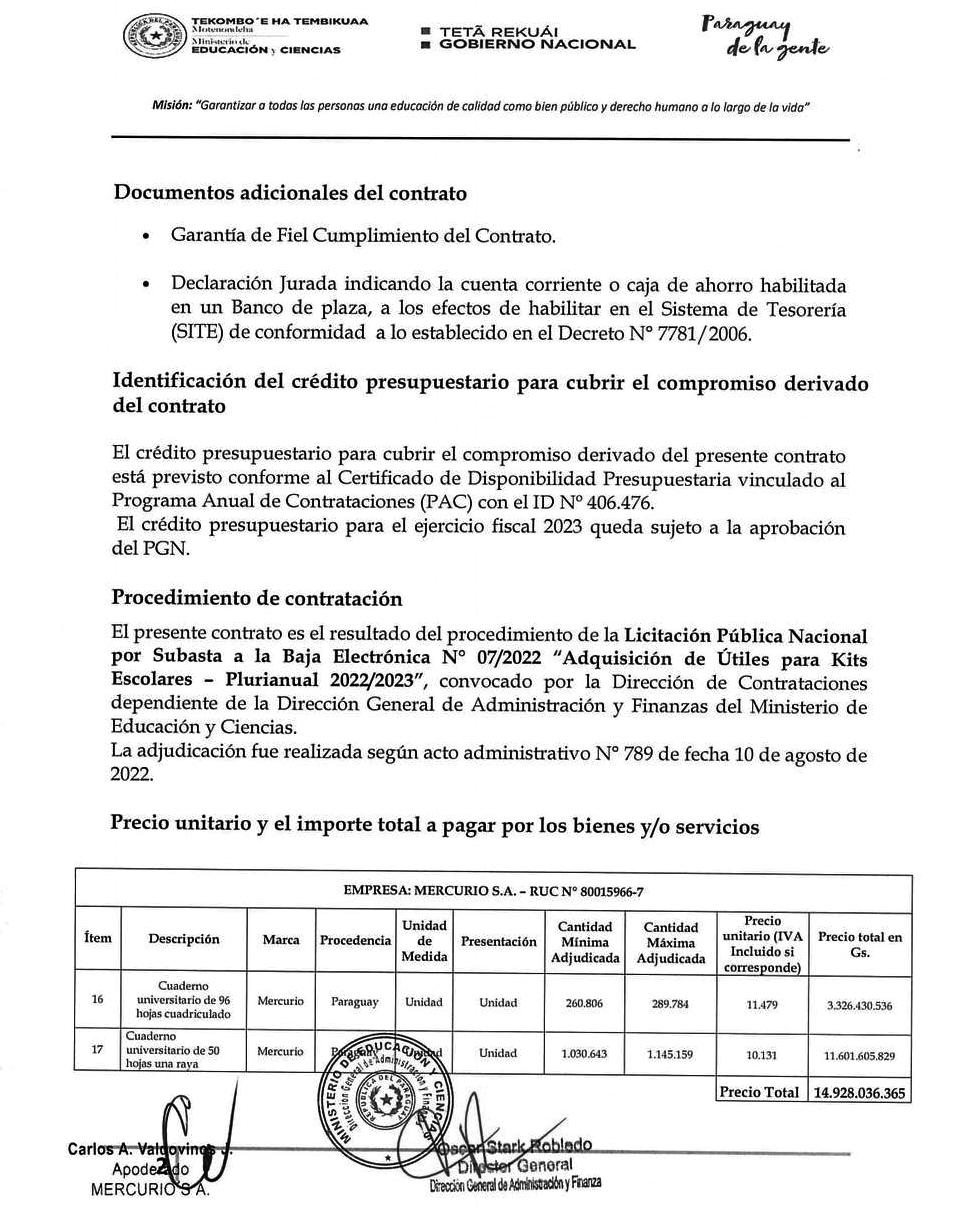 El contrato estipula una provisión de un máximo de 289.784 cuadernos universitarios con 96 hojas cuadriculadas, costando cada uno G. 11.479; y un máximo de 1.145.159 cuadernos universitarios con 50 hojas con una raya presupuestados a G. 10.131 cada uno.