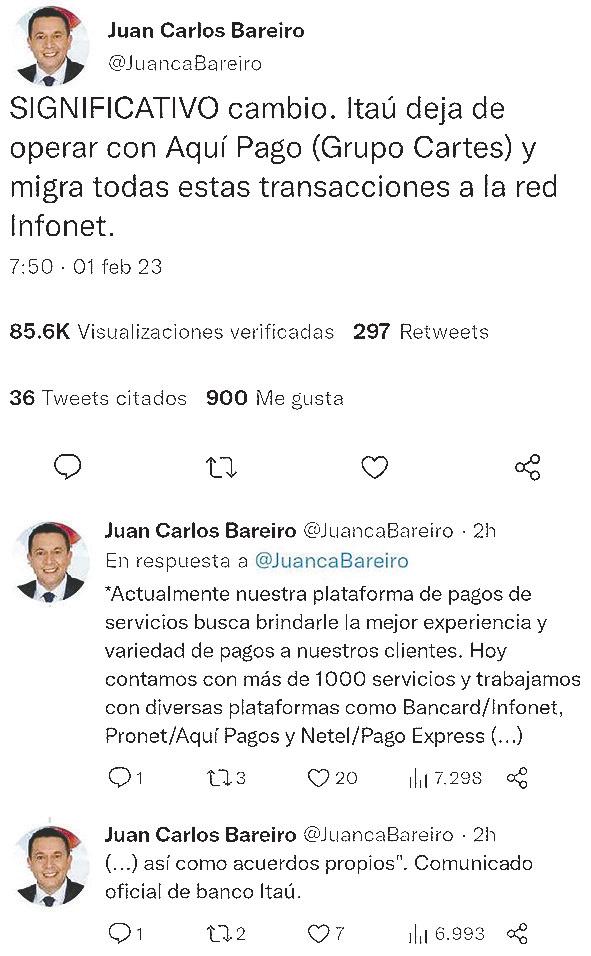 El comunicado de Itaú desmiente lo publicado más temprano por el periodista del Grupo Vierci Juan Carlos Bareiro en su cuenta de Twitter: “SIGNIFICATIVO cambio. Itaú deja de operar con Aquí Pago (Grupo Cartes) y migra todas estas transacciones a la red Infonet”.