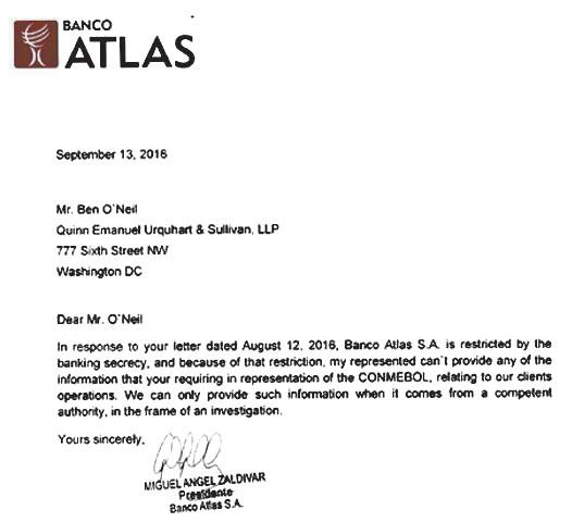 En el 2016 , el presidente del banco Atlas se negó a cooperar con la justicia norteamericana que había solicitado información sobre el movimiento de dinero de Nicolás Leoz. La respuesta del banco fue que se amparaban en el secreto bancario.