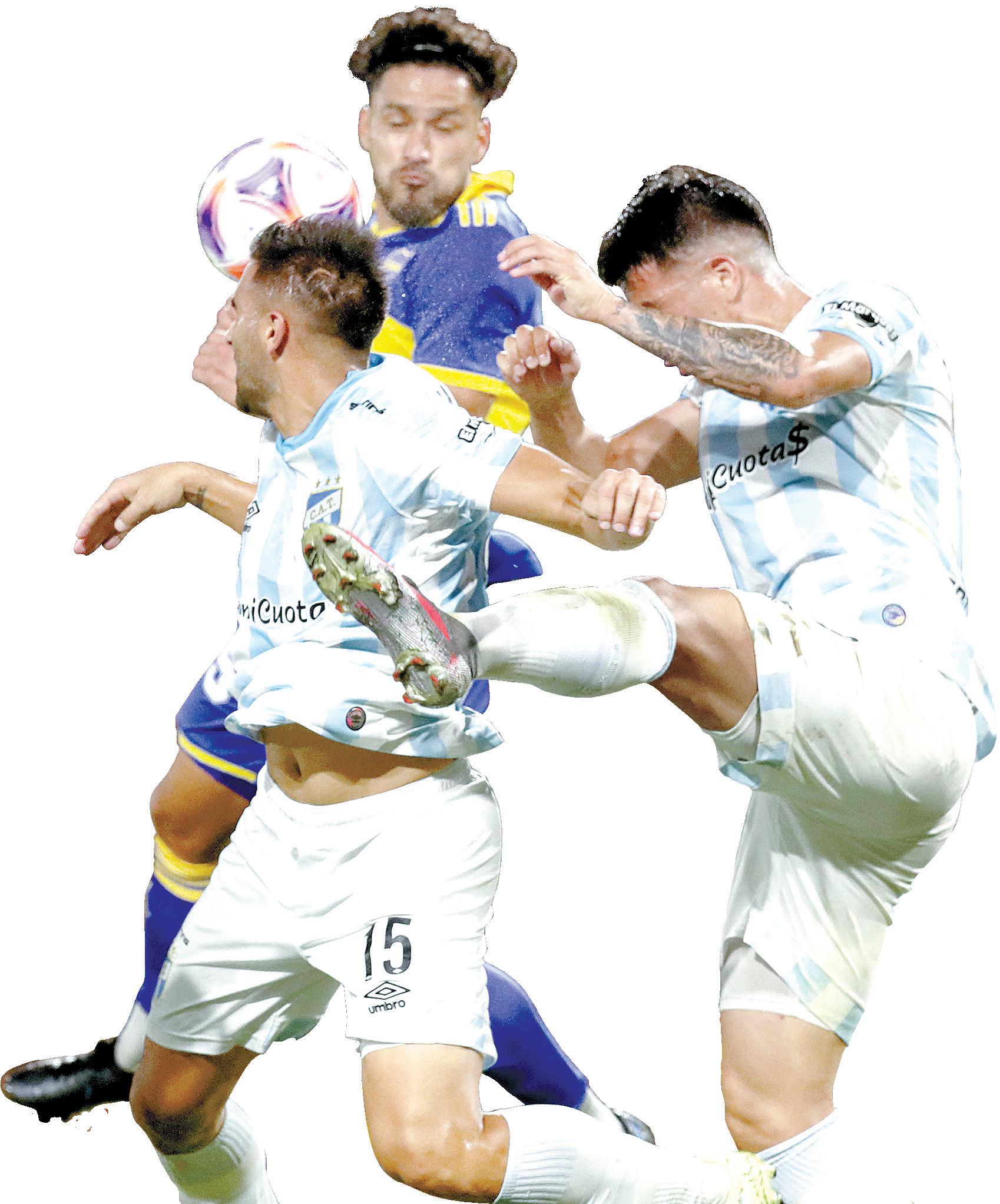 El defensor paraguayo Bruno Valdez se eleva más que todos los jugadores de Atlético Tucumán en la victoria de Boca Juniors.