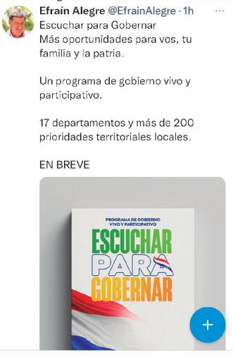 “Escuchar para gobernar. Más oportunidades para vos, tu familia y la patria. Un programa de gobierno vivo y participativo. 17 departamentos y más de 200 prioridades territoriales locales”, anunció el presidenciable liberal en sus redes socia -