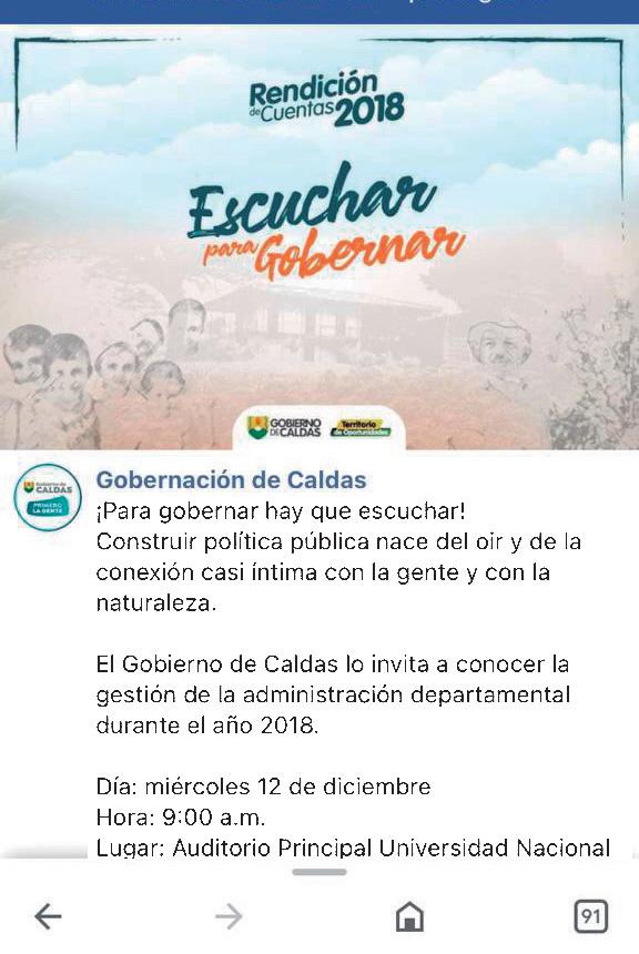 Luego de esa campaña, en el 2018, la ciudad de Caldas de Colombia invitaría a sus pobladores a conocer la gestión de la administración departamental durante ese período de gestión a través del proyecto Escuchar para Gobernar, donde se posicionó la idea de construir la política pública luego de oír