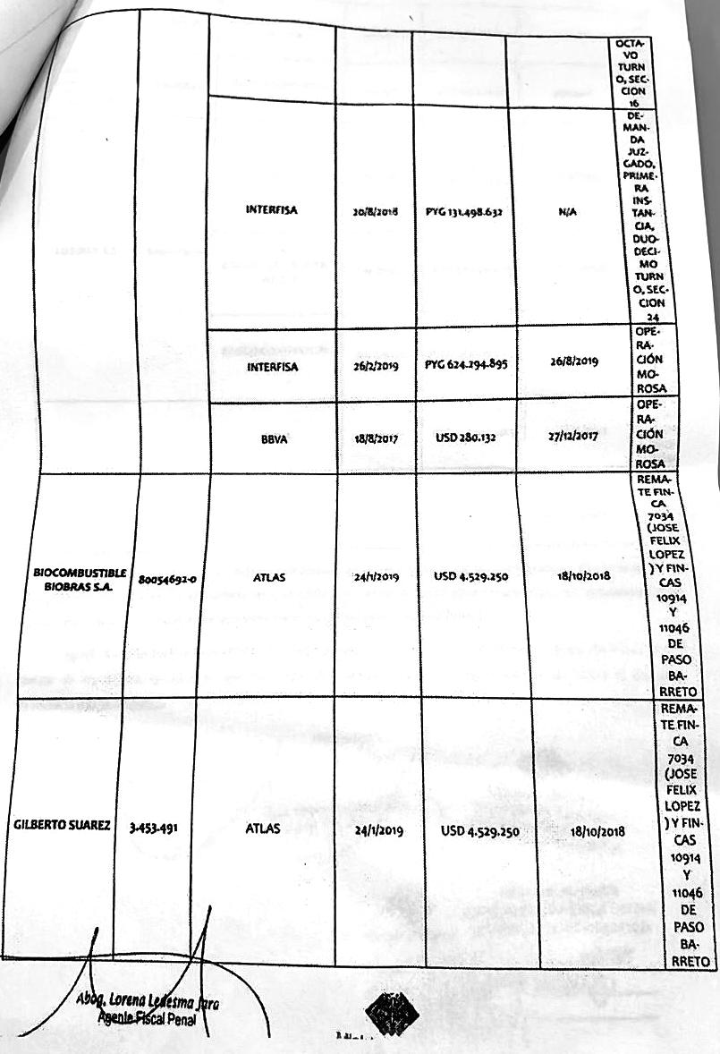 (de la familia Zuccolillo) alegaron que en el año 2015 otorgó un crédito por US$ 4.238.350,67 a Biocombustible Brasilero SA. Justamente, Gilberto Suárez figura como presidente de la empresa y fue quien accedió a la línea de crédito, ofreciendo la estancia Cielo Azul como garantía hipotecaria.