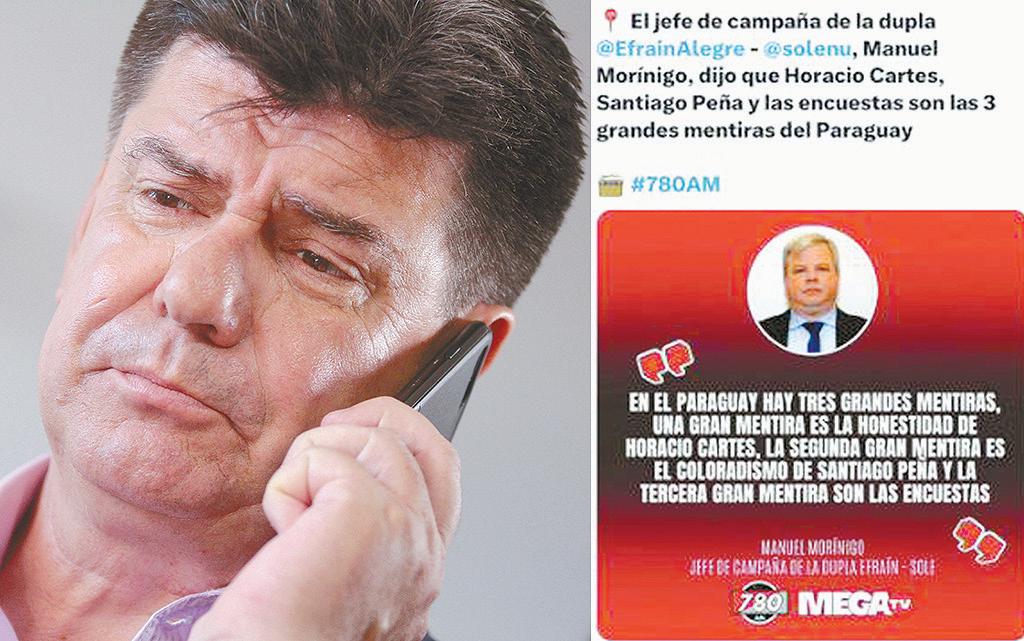 Lo último, digno de un concurso de chistes o memes en redes sociales, es que Natalia Morínigo, hermana de Manuel Morínigo, jefe de campaña de Efraín Alegre, se erige ahora en los medios como la vocera de una encuestadora que pertenecía a su padre, José Nicolás Morínigo (GEO).