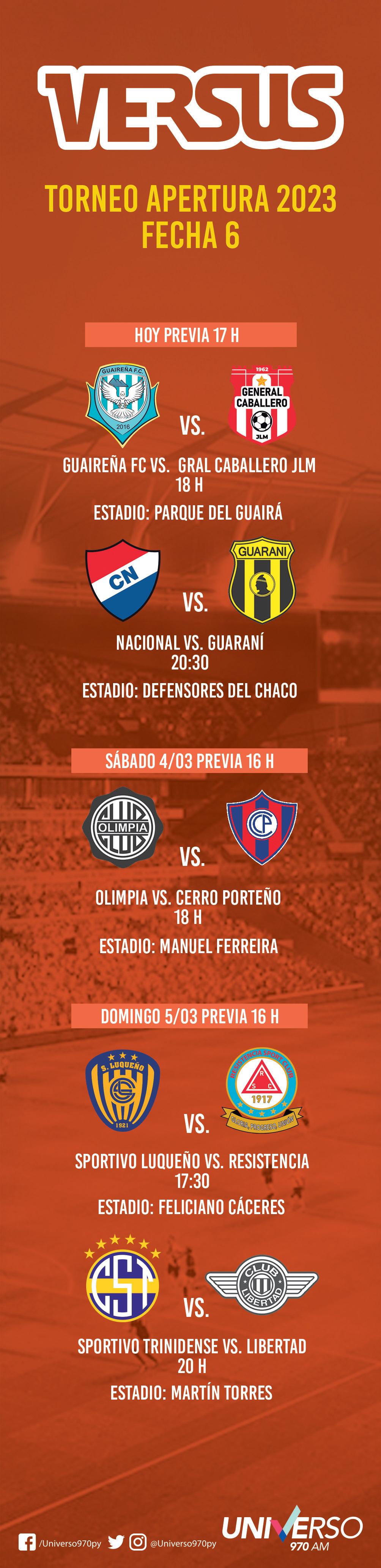 en lugar de Luis Martínez. Por otro lado, en el estadio Parque del Guairá, Guaireña recibe a General Caballero. Milton Maciel es la única variante del local, quien juega en lugar del lesionado Antonio Marín. En el rojo, Alonso reemplaza al suspendido César Castellano.