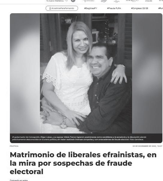 El ex funcionario del Tribunal Superior de Justicia Electoral (TSJE) Édgar López, gobernador hasta unos meses que renunció para pujar por un lugar en el Senado; y su esposa, Vidala Franco Medina, miembro del directorio del Partido Liberal Radical Auténtico (PLRA) que quiere ser diputada, estuvieron en el ojo de la tormenta por supuesto fraude electoral en las elecciones partidarias de diciembre pasado.