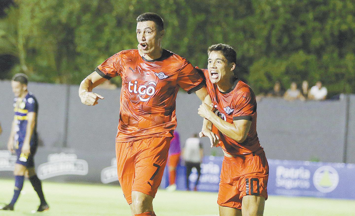 Óscar “Tacuara” Cardozo festejando su gol 101 frente a Trinidense con Lorenzo Melgarejo.