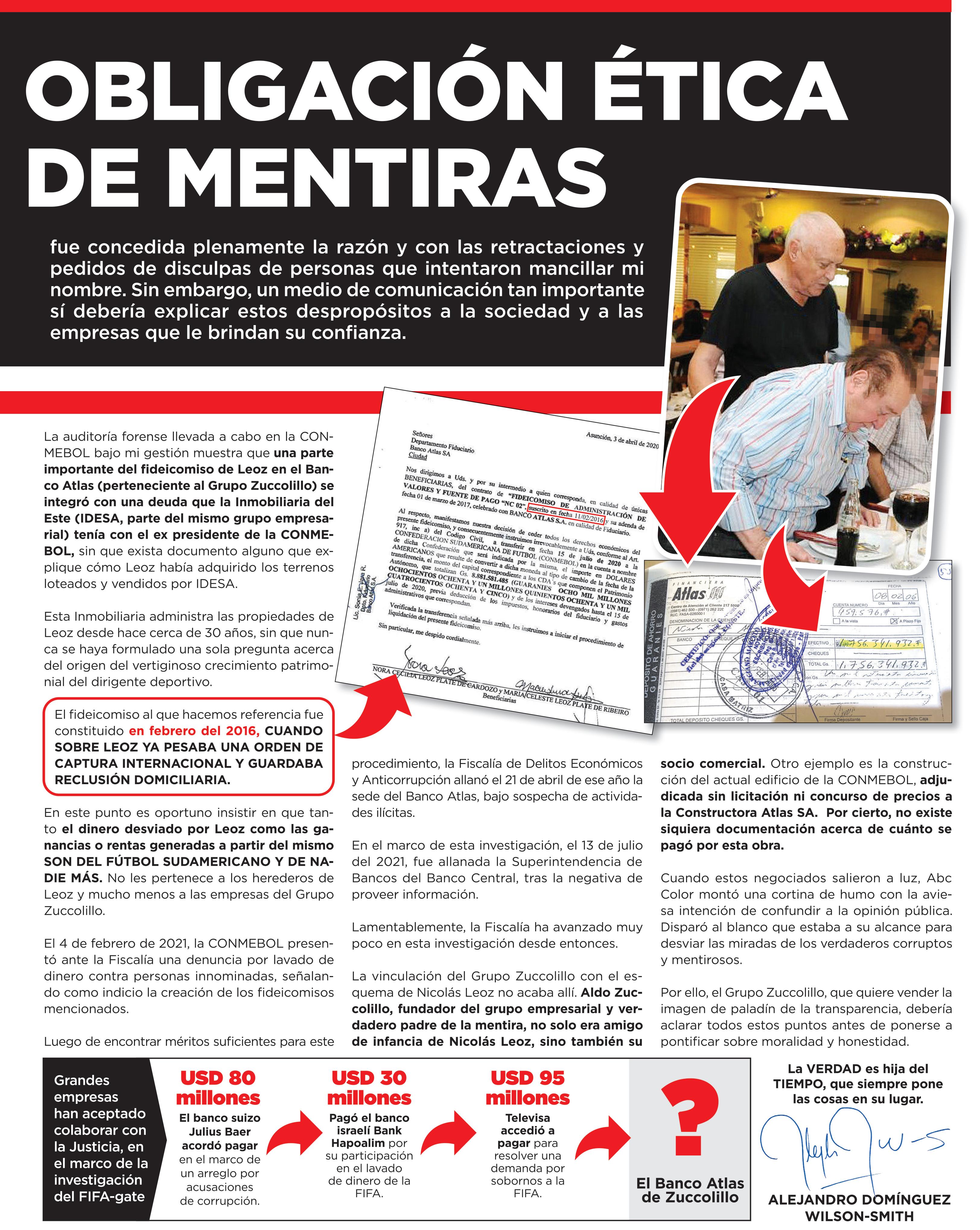 A instancias de la denuncia presentada por la Confederación Sudamericana de Fútbol (Conmebol), el Ministerio Público llevará adelante diligencias para solicitar al banco Atlas, perteneciente al grupo Zuccolillo, que devuelva el dinero obtenido a través de operaciones realizadas por Nicolás Leoz. La figura que aplicará la Fiscalía es la del comiso autónomo, a través de la cual se ordenará que el banco Atlas devuelva las ganancias y beneficios de los contratos de fideicomiso