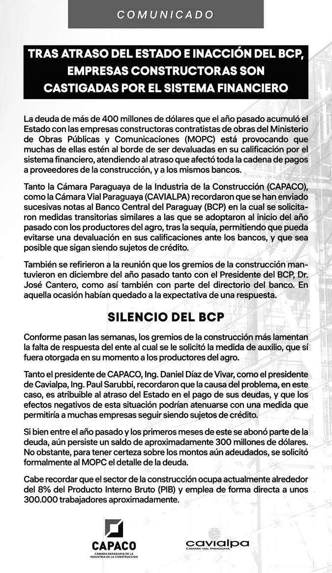 La Cámara Paraguaya de la Industria de la Construcción (Capaco) y la Cámara Vial Paraguaya (Cavialpa) se pronunciaron ante la deuda del Estado que les afecta sobremanera. A través de un comunicado denuncian que las empresas constructoras podrían ser castigadas por el sistema financiero, provocando así ser devaluadas en su calificación.