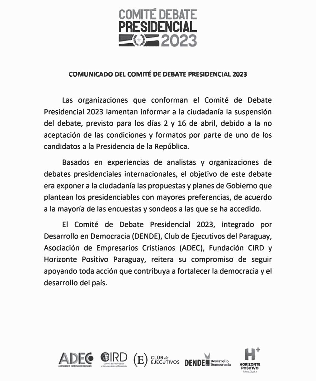 Euclides Acevedo, ex ministro del Interior y ex canciller, y que cuenta con el senador Jorge Querey como aliado para la Vicepresidencia de la República, habló, entre otros temas, del debate presidencial que había sido organizado y posteriormente suspendido Desarrollo en Democracia (Dende) y otras organizaciones civiles, que cursaron la invitación solo a dos de los 13 candidatos presidenciales, reduciendo el foro a un bipartidismo basado en el formato de EEUU, según alegaron: Santiago Peña del Partido Colorado y Efraín Alegre de la Concertación Nacional.