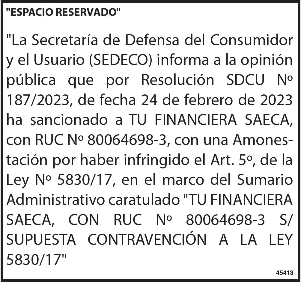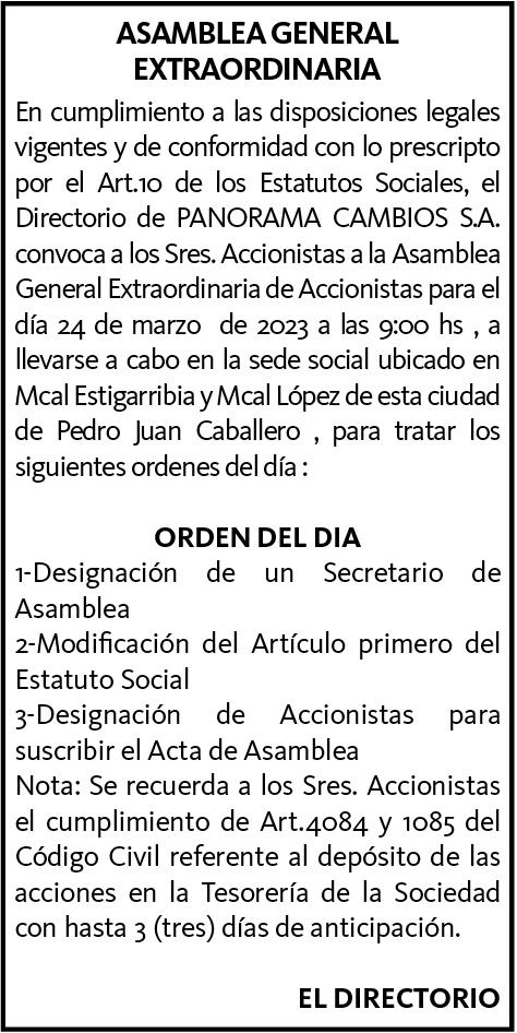 ASAMBLEA GENERAL ORDINARIA. El Directorio de AGROFORESTAL KAAGUY PORÃ S.A., con RUC Nº 80052450-0, convoca a sus accionistas a la Asamblea General Ordinaria a llevarse a cabo el día viernes 24/ marzo/2023, a las 07:00 horas en primera convocatoria y a las 08:00 horas en segunda convocatoria, en el local de la sociedad, sito en la ciudad de San José de los Arroyos, a los efectos de considerar el siguiente Orden del día: 1-Designación de un presidente y secretario de asamblea. 2- Lectura y consideración de la memoria del directorio, balance general, cuadro de resultados e informe del síndico correspondiente al ejercicio económico cerrado al 31/diciembre/2022. 3- Distribución de utilidades. 4- Elección de miembros del directorio, síndicos y fijación de sus remuneraciones para el ejercicio 2023. 5- Elección de Accionistas para la suscripción del Acta. La Comisión Directiva.