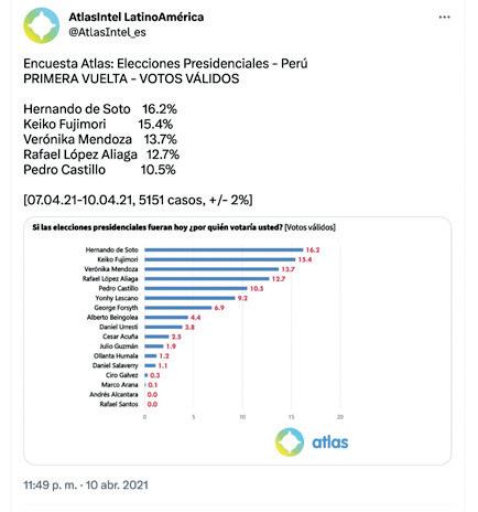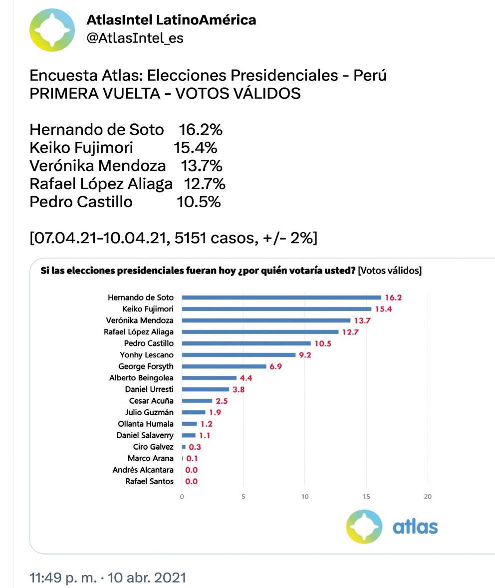 Verónica Mendoza, 13%, ubicando a Pedro Castillo con solo el 10%. Finalmente, la primera vuelta electoral del 11 de abril finalizó de esta manera: Pedro Castillo con el 19% y Keiko Fujimori con 13%. El Trueno resalta:“El error fue tal que ni siquiera presentaron pronóstico