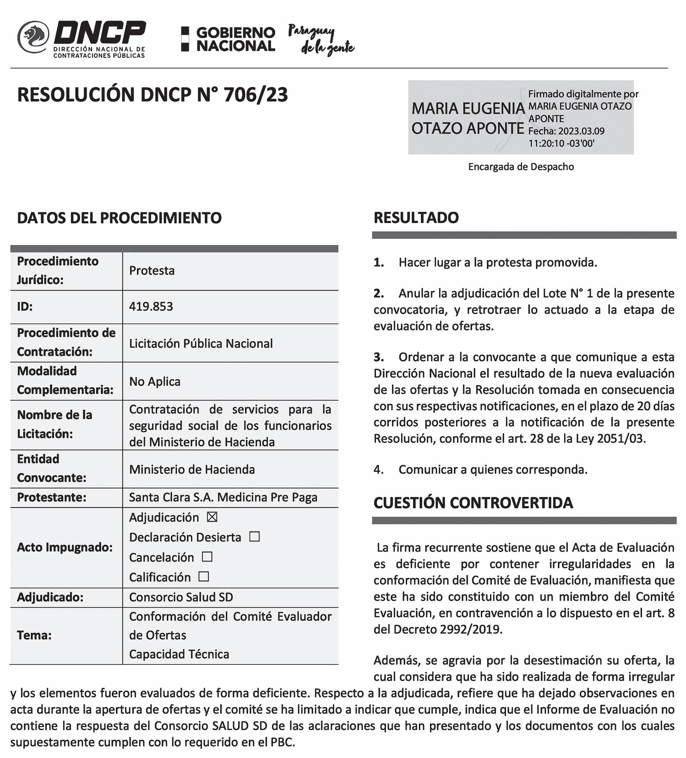 La controversia se centra en la adjudicación del Lote 1, que representa el 99% del paquete total y fue adjudicado en sus inicios al Consorcio Salud SD, lo que posteriormente fue revisado por la DNCP a raíz de una protesta presentada por uno de los oferentes, en este caso el Sanatorio Santa Clara SA.