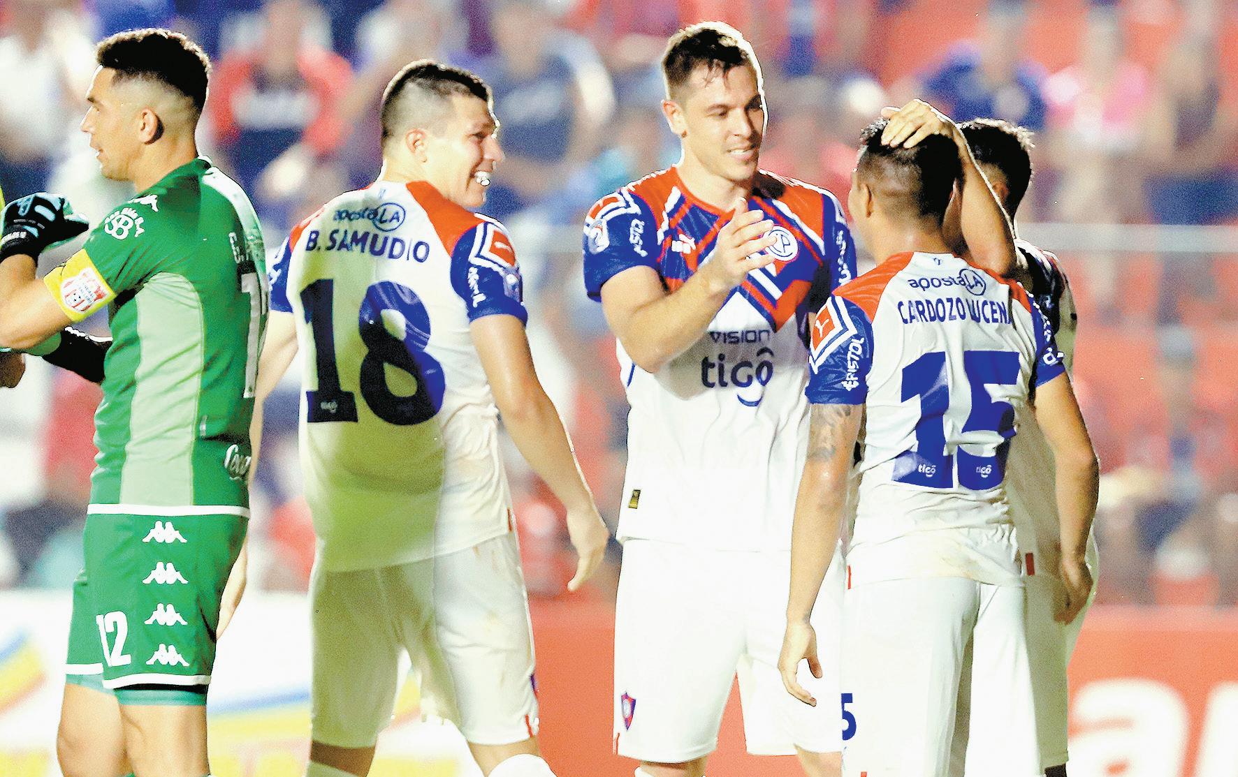 Diego Churín, la figura del partido y autor del segundo gol, recibe el saludo de Braian Samudio y Ángel Cardozo.