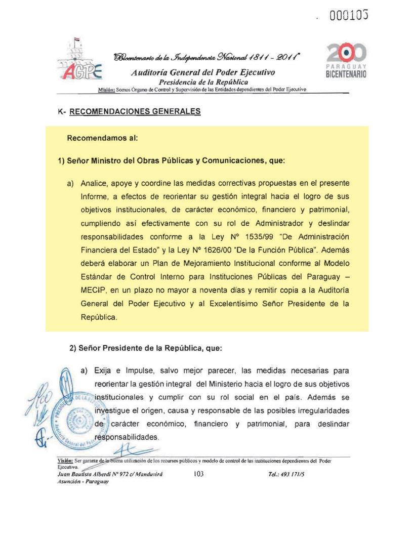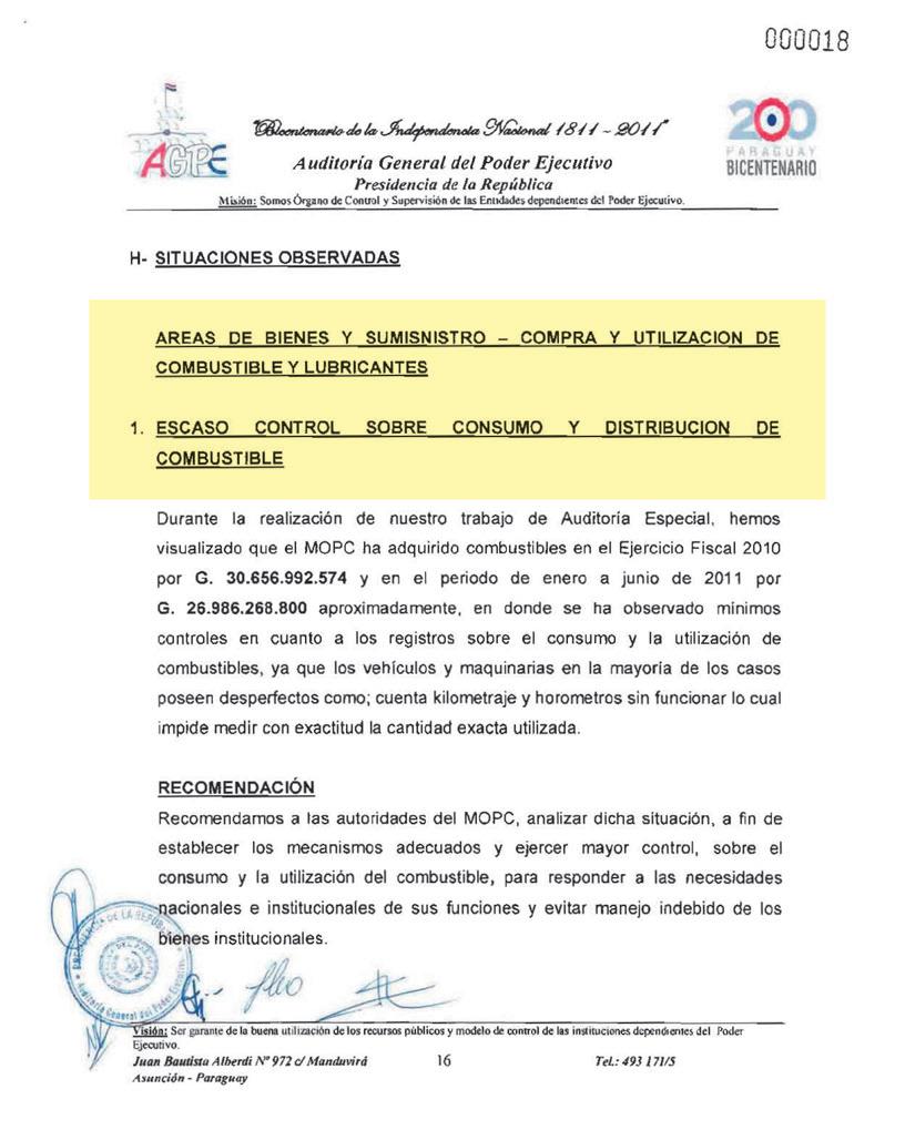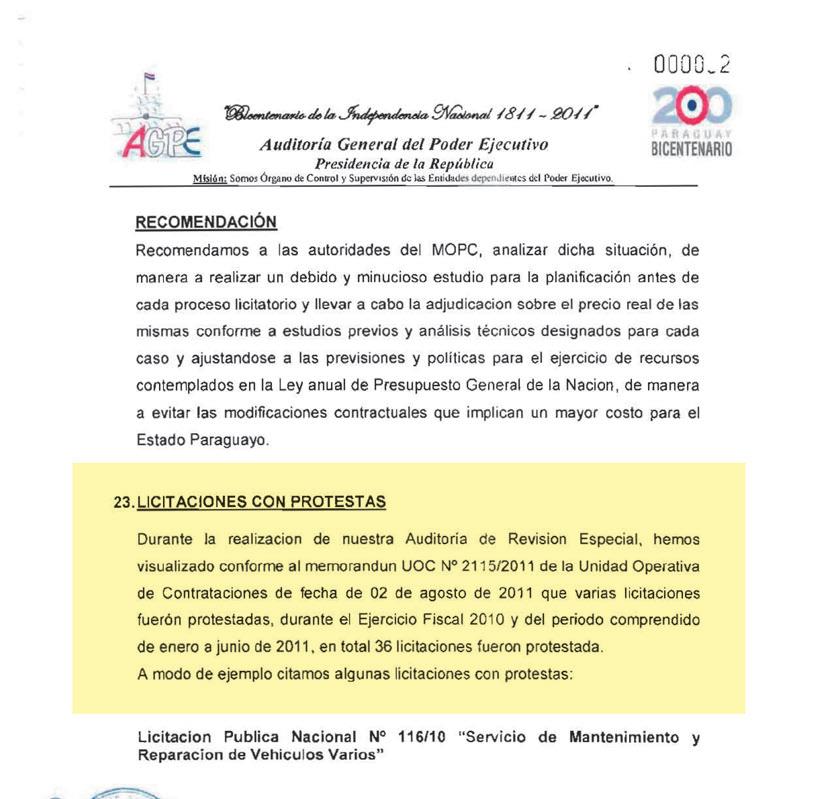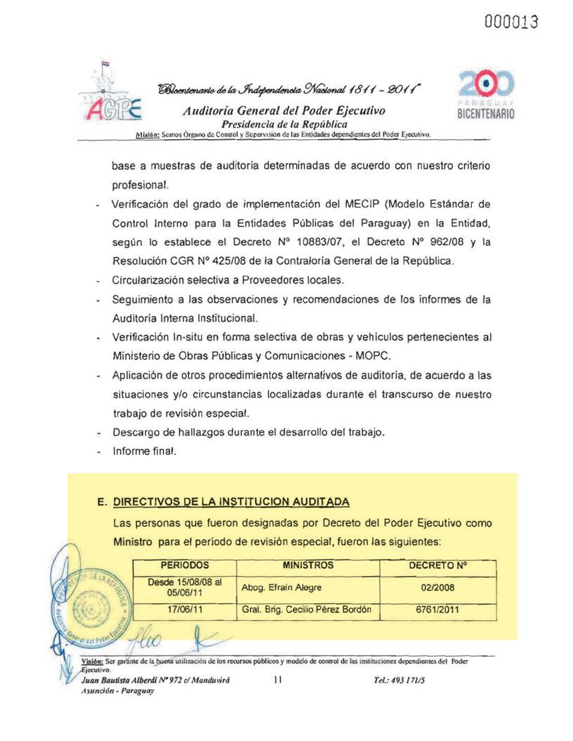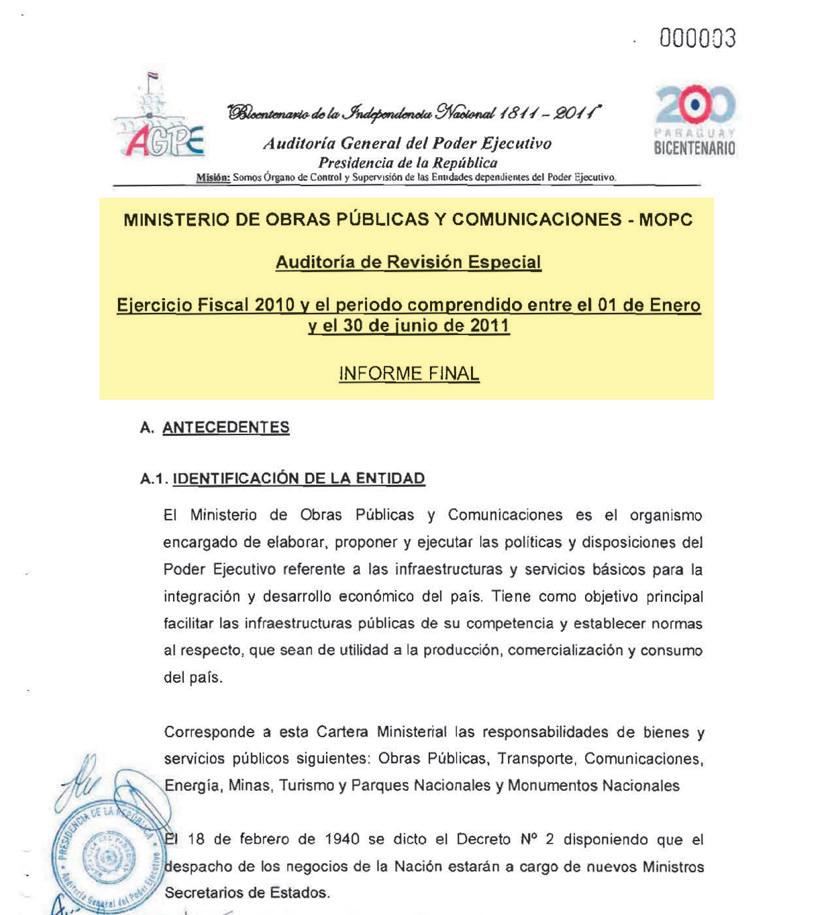 manejos del entonces ministro Efraín Alegre al frente del Ministerio de Obras Públicas, fue encomendada una fiscalización de carácter confidencial que finalizó el 30 de noviembre del 2011, pero que fue cajoneada por el Poder Ejecutivo.