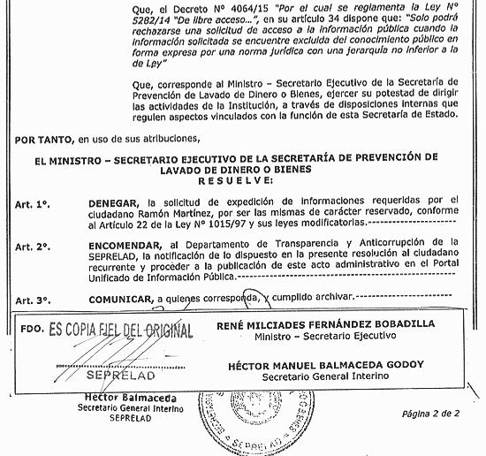 “por ser las mismas de carácter reservado”, según refiere el documento firmado por el ministro, René Fernández Bobadilla.