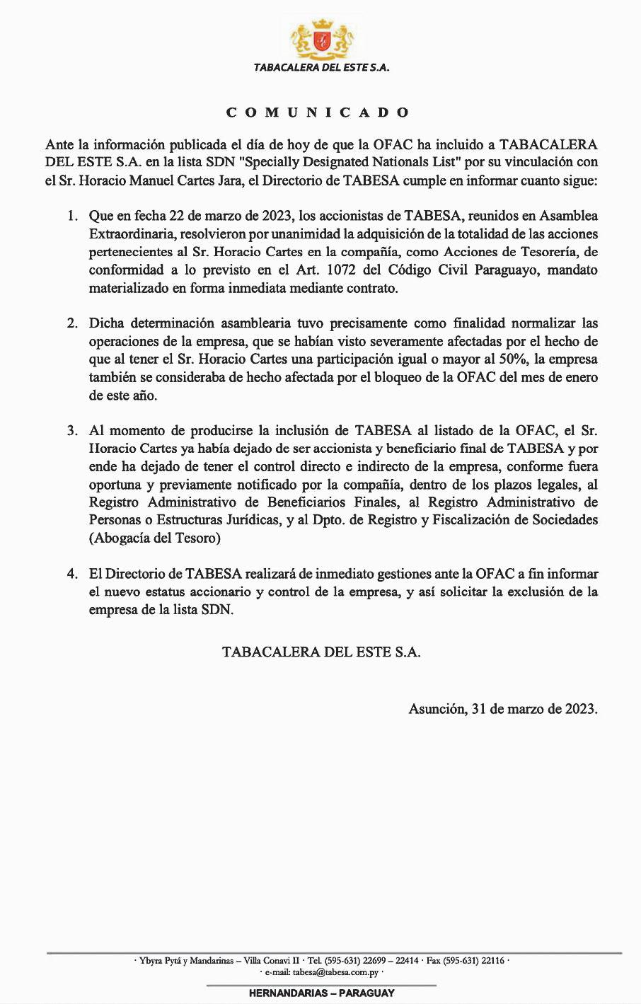 Tabacalera del Este SA informó que el 22 de marzo del 2023 los accionistas de la firma resolvieron la adquisición de la totalidad de las acciones pertenecientes a Horacio Cartes en la compañía, normalizando así las operaciones de la empresa.