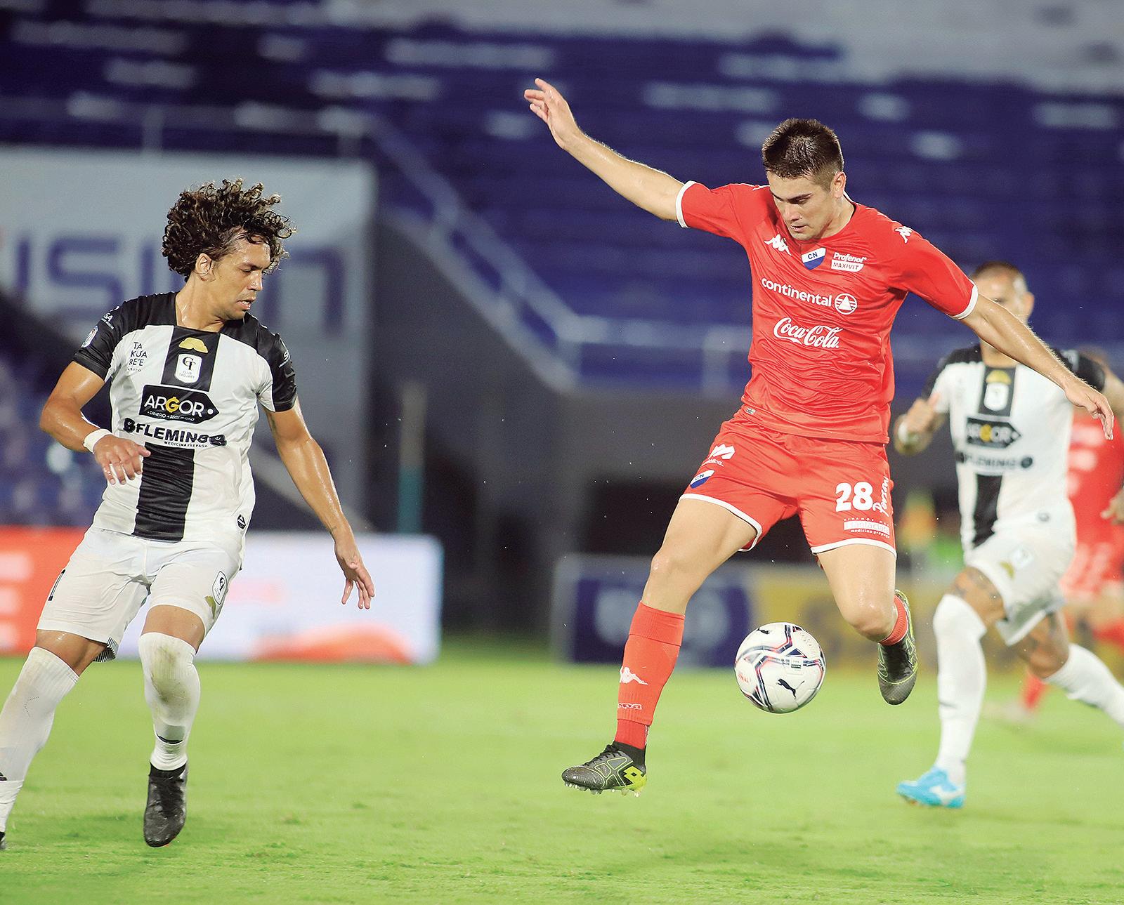 Cristhian Ocampos de Nacional intenta controlar le balón ante la presión de Edgar Benítez.