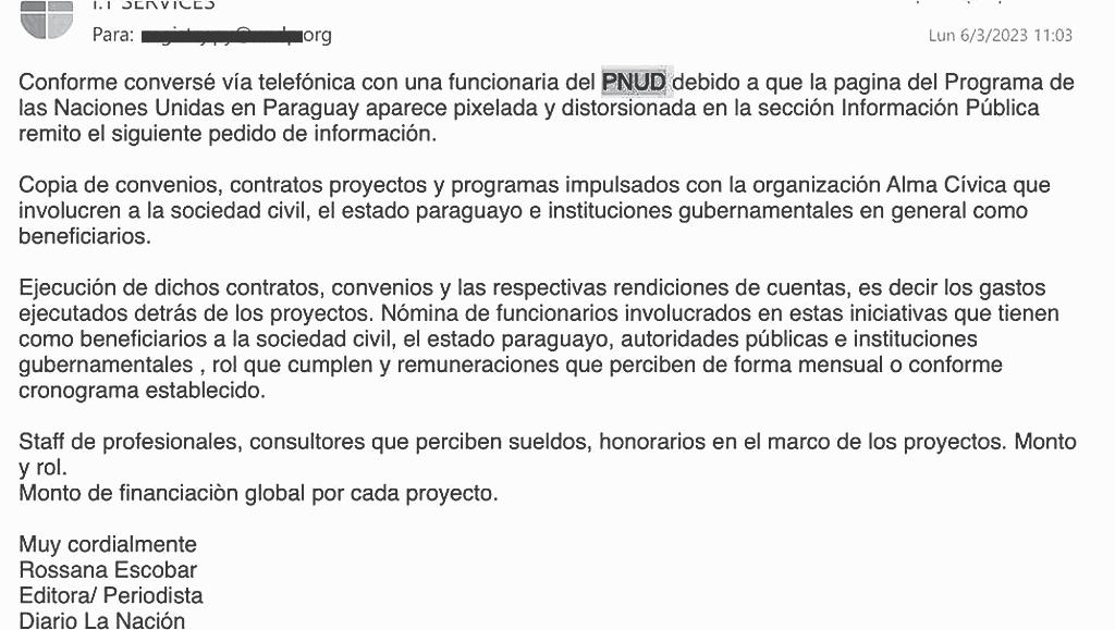Tras reiteradas comunicaciones telefónicas nos facilitaron un correo electrónico para el pedido de la información sobre la rendición de gastos de los proyectos de la ONG que respalda el PNUD. El mail con la solicitud de información tiene fecha 6 de marzo, volvimos a insistir varias veces por