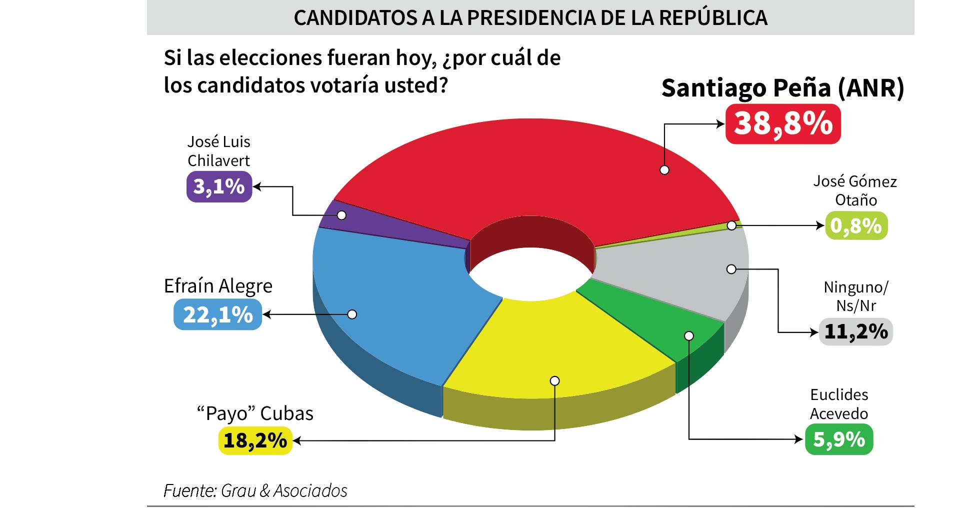 Una encuesta de Grau & Asociados, a menos de un mes de las elecciones, arroja que Santiago Peña sigue liderando la intención de voto en Asunción con una ventaja del 17% sobre Efraín Alegre. Para la Cámara de Diputados, los dos primeros lugares encabezan también los candidatos del Partido Colorado, Raúl Latorre con intención de voto de 21,5%, seguido por “Dani” Centurión con el 13,1%. P. 2