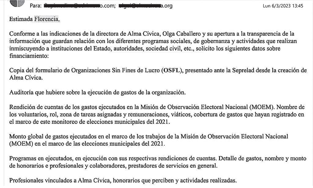 Misma fecha, 6 de marzo pasado, también conversamos con la directora de Alma Cívica, Olga Caballero, para consultar sobre la fuente de financiamiento de la ONG. En primera instancia facilitó un correo para los datos requeridos, pero luego derivó con su agencia de prensa.