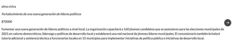 La única información trascendida del dinero que recibe Alma Cívica es la publicada en el portal de la Fundación Nacional para la Democracia, conocida por sus siglas en inglés (NED), que le otorgó a la ONG de Núñez en el 2021 US$ 70.000 para “capacitar a 160 jóvenes candidatos que se postularon para las elecciones municipales”.