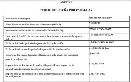 También recibieron US$ 353 mil en su ONG Enseña por Paraguay por parte de la Agencia de los Estados Unidos para el Desarrollo Internacional, conocida por sus siglas en inglés (Usaid) a través de Teach-For-All, para contratar profesores en aulas en Central y Presidente Hayes.