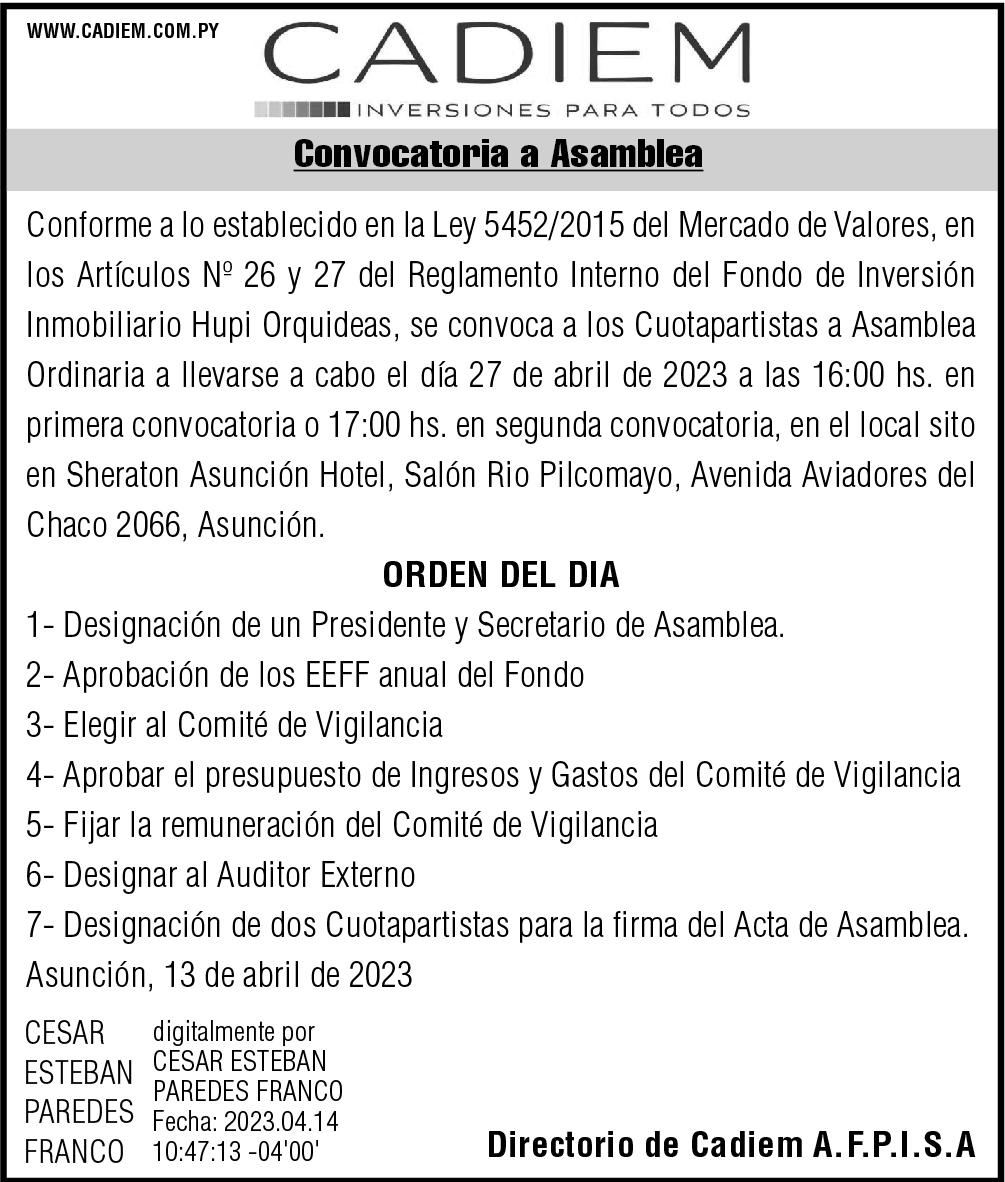 SUCESIÓN. LA JUEZA DE PRIMERA INSTANCIA EN LO CIVIL Y COMERCIAL DEL SEGUNDO TURNO DE LA TERCERA CIRCUNSCRIPCION JUDICIAL DE LA REPUBLICA, Abg. Rossana Aurora Veron de Arca , cita y emplaza por sesenta dias a herederos y acreedores de la Sucesión de CESAR RUBEN OVIEDO FRANCO . El juicio radica en la secretaria N° 3 a mi cargo Abg, Aicia Fiorella Farias Martinez, Actuaria Judicial. ENCARNACION 03 DE ABRIL 2023. Se hace saber al destinatario de este edicto que el mismo cuenta con el Código QR, por lo cual, para tener certeza de que este documento es valido, debera utilizar el lector de Codigo QR, siendo ya en consecuencia, innecesaria la autenticación manual de la Actuaria del Juzgado conforme Acordada 1366/2019.-47695/17/04.-