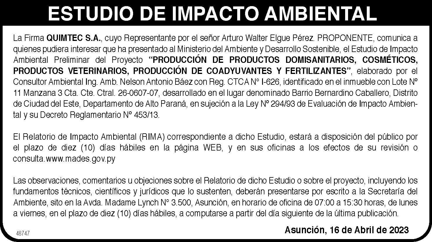 Asunción, 21 de Marzo de 2023.Orden de Publicación de SOLICITUD de Patente de Invención (12) DATOS DE LA SOLICITUD (21) Nº de Solicitud: 2022-2270495 (22) Fecha de Solicitud: 16/08/2022 11:22:17 (71) Solicitante: ADAMA CHILE SA. Domicilio