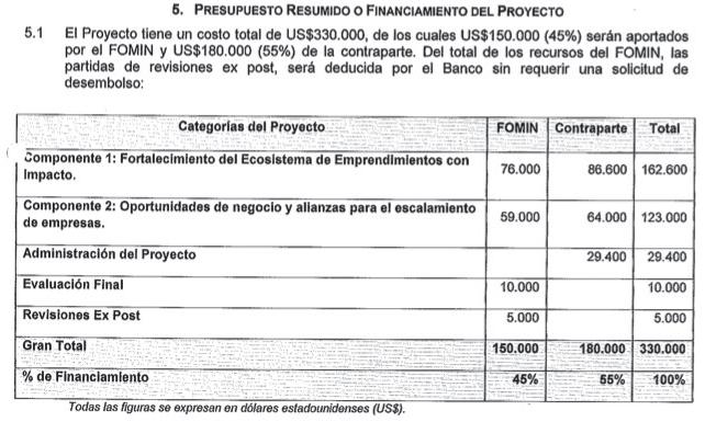 miento de US$ 330 mil, de los cuales 45% provienen del BID y el resto de contrapartida local en la que aparecen como parte de las operaciones Conacyt, Mitic, MIC y sector privado que en este caso es Koga. El proyecto deja bien en claro que toda la articulación está atada a Koga y en el objetivo de la ONG de “mejorar la productividad y la competitividad de las empresas” aparecen un montón de consultorías en las que de vuelta son beneficiados los amigos miembros de la