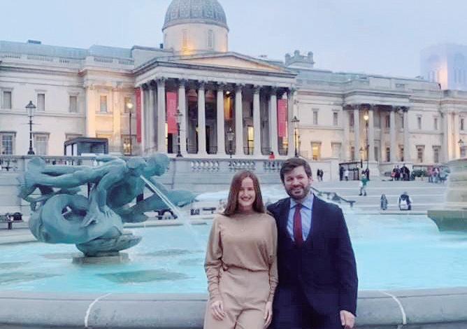 Soledad Nuñez y Bruno Defelippe, posando frente a la plaza Trafalgar Square de Londres, publicado en el 2021 Romántica fotografía entre pingüinos de la región sur.