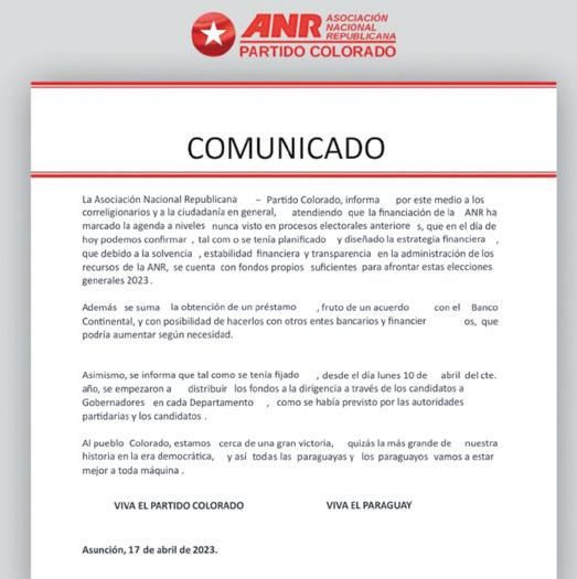 La ANR emitió ayer un comunicado informando que la campaña del Partido Colorado está financiada gracias a los recursos propios y a la obtención de un crédito bancario, echando por tierra la bandera de ciertos medios aliados a la oposición quienes trataron de instalar la existencia de problemas financieros en la institución. P. 6