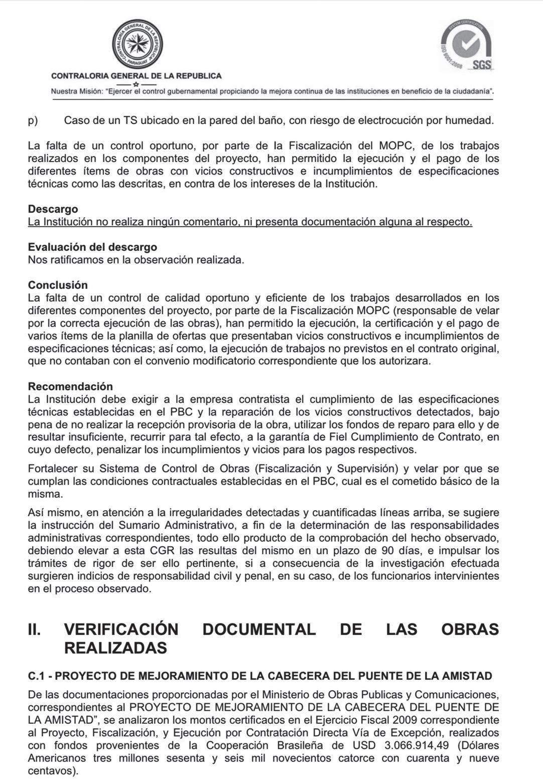 9- También al verificar los trabajos de mejoramiento de la cabecera lado paraguayo del Puente de la Amistad, los intervinientes detectaron en esta obra rubros que fueron certificados y pagados por demás, cuya cuantificación arroja el monto de G. 156.810.725.