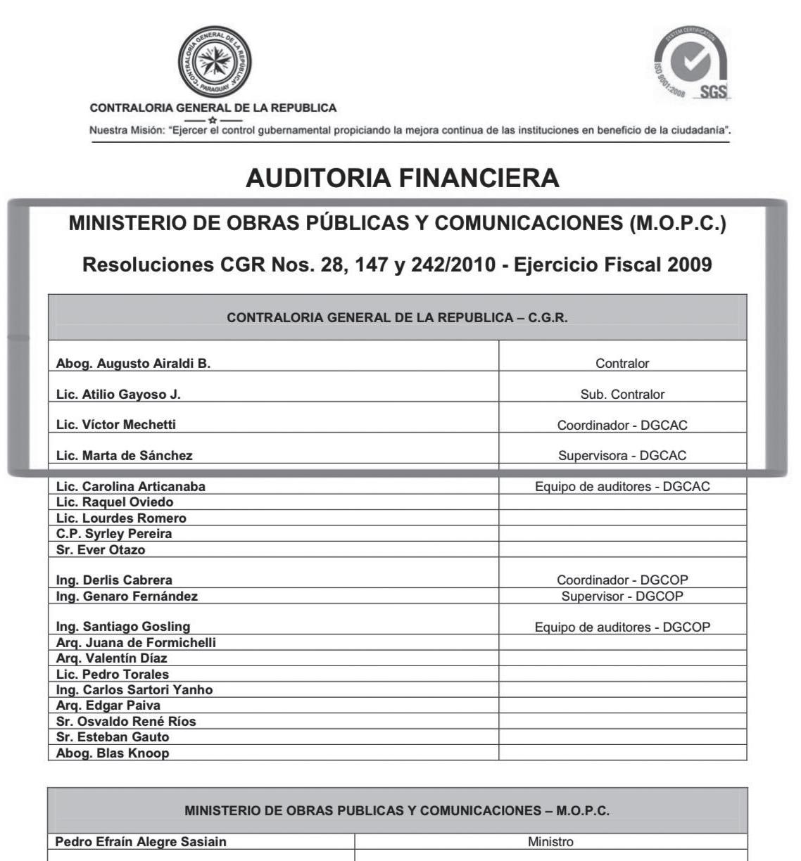 El equipo auditor designado analizó el Balance General y Cuadro de Gestión Económica del MOPC, del período comprendido entre el 1 de enero y el 31 de diciembre del 2009, cuando Efraín Alegre se desempeñaba como ministro, Andrés Rivarola como viceministro de Obras, Juan Félix Bogado Tatter se encargaba de la Administración y Finanzas, Eduardo Petta era el director de la Caminera y Mercedes Canese estaba en el Viceministerio de Minas y Energía.