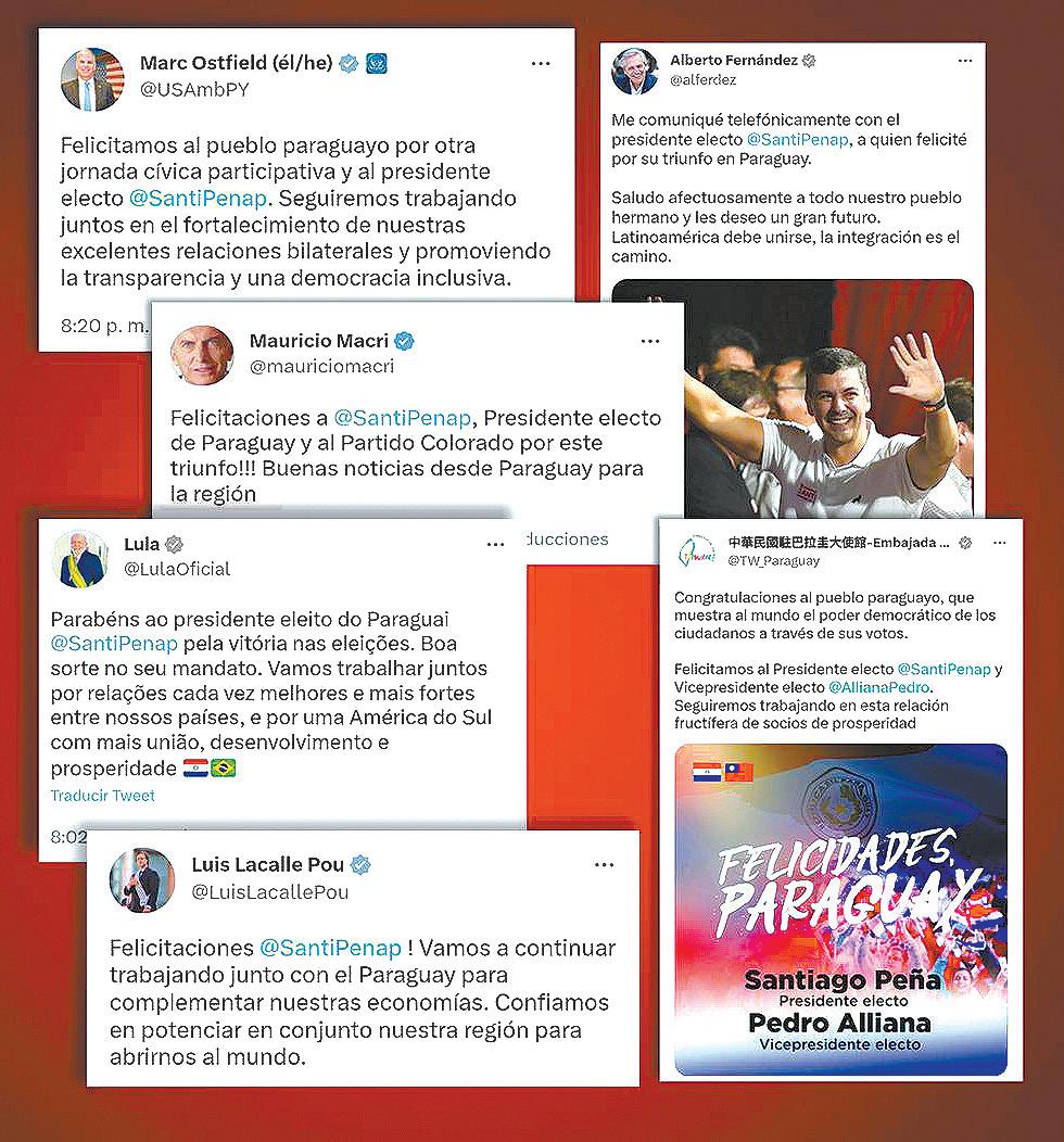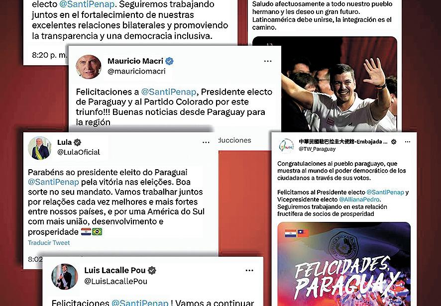 El electo presidente de la República, Santiago Peña, tras su contundente victoria en las elecciones generales de nuestro país ha recibido el reconocimiento inmediato vía redes sociales de varios gobernantes de la región y el mundo y de altos cargos de gobiernos como Israel, Ucrania y la República de China (Taiwán).