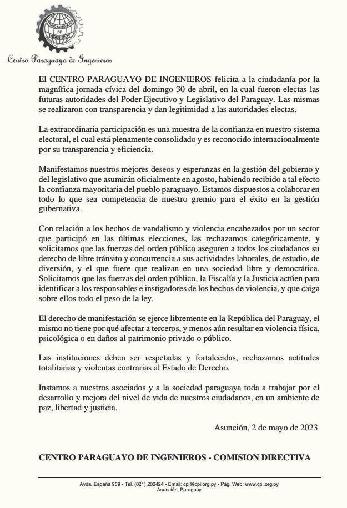 El Centro Paraguayo de Ingenieros emitió un comunicado en el que califica de magní-