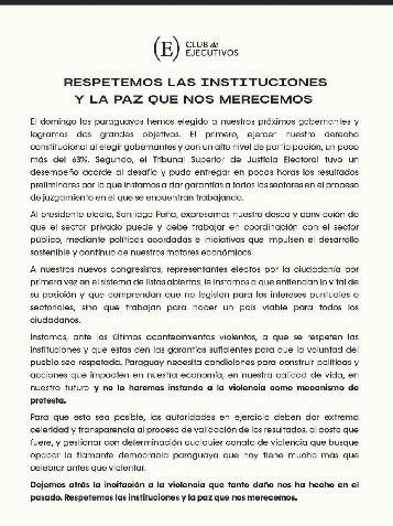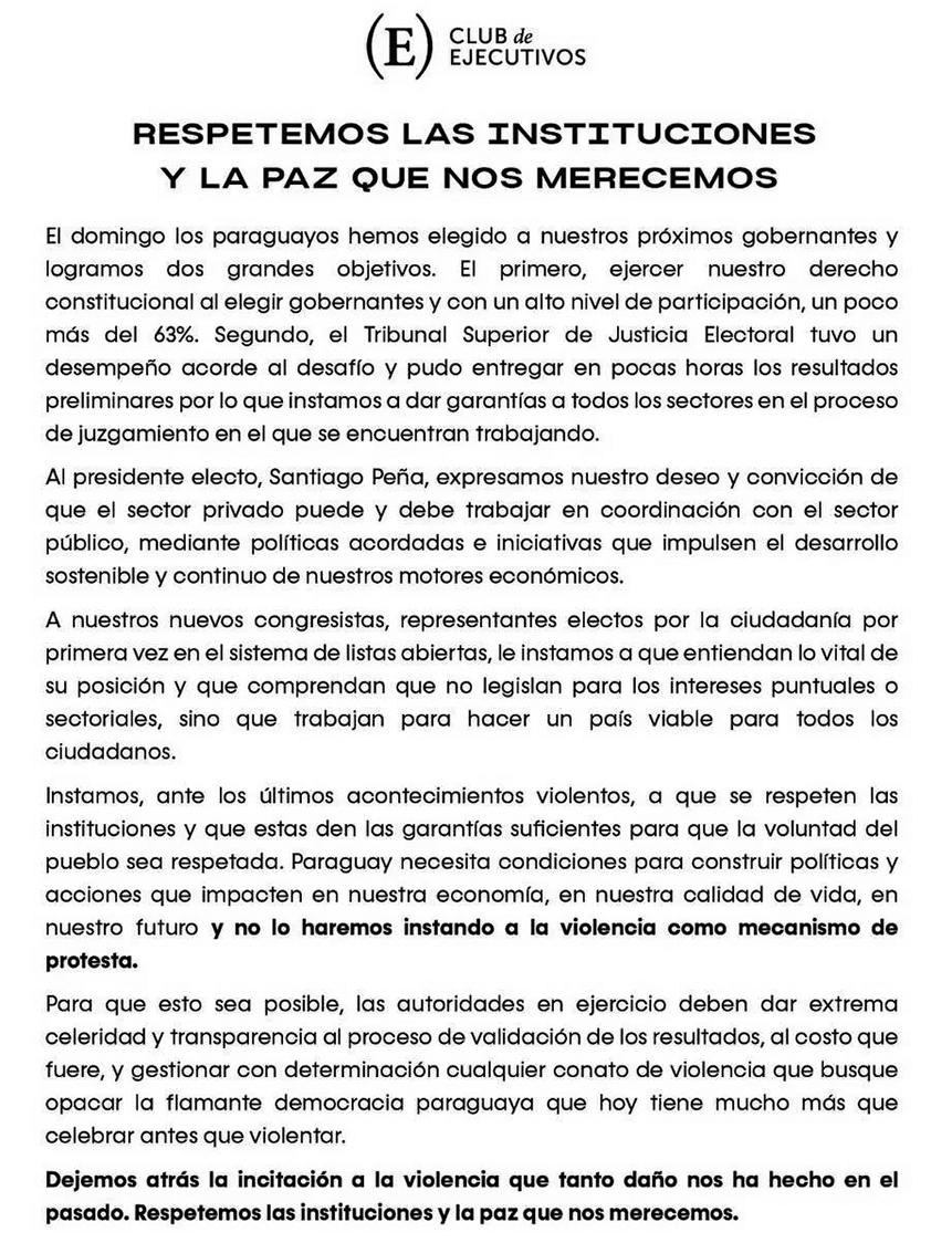 El Club de Ejecutivos emitió un comunicado a través del cual expresa su respaldo al Tribunal Superior de Justicia Electoral (TSJE) por el trabajo desempeñado en los comicios del pasado 30 de abril. Además de esto, manifiesta su deseo de trabajar coordinadamente con las autoridades electas, entre ellas Santiago Peña, y clama por el cese de los hechos de violencia reportados en varios puntos del país.