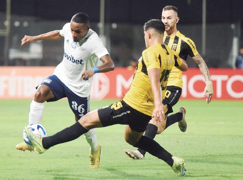 Gabriel Báez es derribado por la presión de Brian Bentaberry, en una jornada para el olvido en la Nueva Olla Un equipo sin alma de Cerro Porteño fue goleado en su propia Olla, por el Bolívar, 4 a 0 y ocupa la parte baja del grupo C.