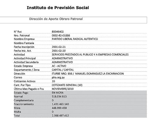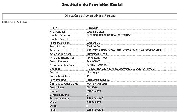 Santiago Rodríguez santiago.rodriguez@nacionmedia.comEn medio de una avalancha de críticas sobre el descalabro administrativo del Partido Liberal Radical Auténtico (PLRA), durante la administración de Efraín Alegre, salta que la agrupación política adeuda G. 2.398 millones al Instituto de Previsión Social (IPS) en concepto del pago del seguro social de sus funcionarios.