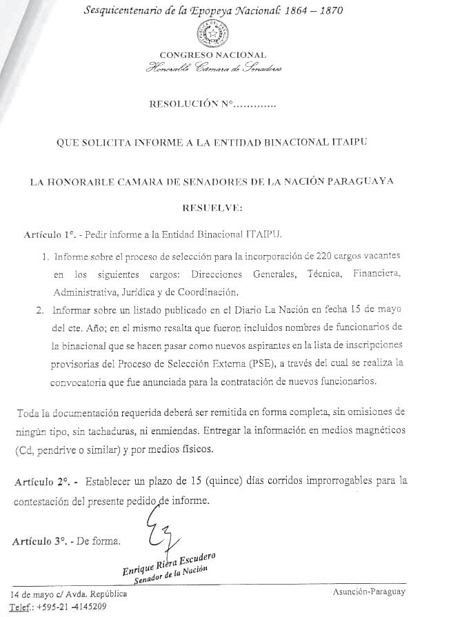El pedido impulsado por el senador Enrique Riera fue aprobado con 27 votos a favor durante la sesión ordinaria de ayer y por el cual se requiere los documentos del proceso de selección para la incorporación de 220 profesionales en la hidroeléctrica. La documentación deberá ser entregada en medios magnéticos y físicos en un plazo máximo de 15 días corridos improrrogable.