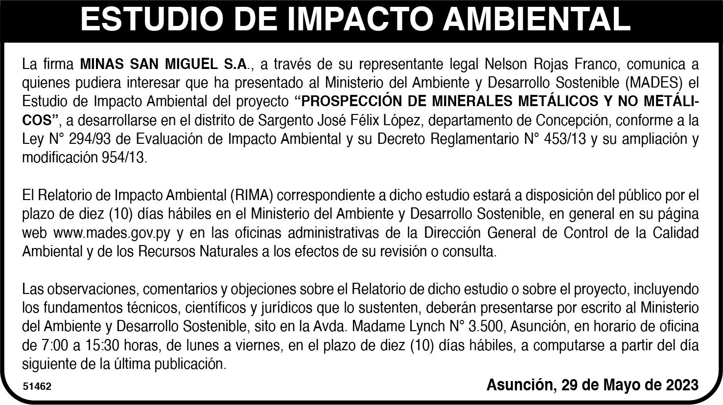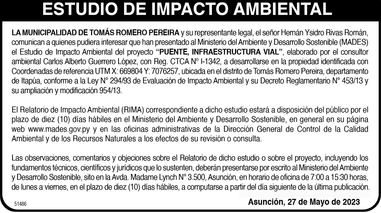 MENSURA.Comunico a quiénes tengan interés y en especial a las partes linderas que el día 15 de junio del 2.023, a las 13: 30 horas daré inicio a las operaciones técnicas de mensura Judicial, de una fracción de terreno presumiblemente fiscal, propiedad del Indert, ubicado en la colonia denominado Heriberta Matiauda, Distrito de San Bernardino, Dpto. de Cordillera, solicitado al Indert, por el señor BRAULIO ANTONIO GIMÉNEZ NÚÑEZ, según Exp. Adm. N° 4.546/2.023, R.P. N° 145/2.023, los linderos son los sgts.: Al Norte: derechos desconocidos, Al Sur: Rio Salado, Al Este: derechos desconocidos, al Oeste: Derechos desconocidos. El Juicio se tramita en el Juzgado de Paz de San Bernardino, a cargo de la Abogado Lilian Rosana Cabello de Deggeller., Secretaria Gladys Z. León Torres, La comisión de Mensura fue conferida al Suscripto quién acompañado del Juzgado se constituirán en el esquinero Nort - Este del poligono para dar inicio a los trabajos técnicos. Asunción, mayo del 2.023. Lic. Filemon Melgarejo Zayas.51460/31/05.CIRCULAR DE MENSURA. Comunico a quienes puedan tener interés, especialmente a las partes linderas, que el día 14/06/2023 a las 14:30 horas, daremos inicio a las operaciones técnicas de Mensura Judicial del inmueble presumiblemente Fiscal, solicitado al INDERT por DARÍO INOCENCIO GENES ENCISO, según Exp. Adm. N° 27.140/2.021, ubicado en el lugar denominado “Colonia General Díaz”, Distrito de Concepción, Dpto. de Concepción, cuyos linderos son: Al Norte: Calle, Al Este: Lote N° 25, Al Sur: Derecho privado y Al Oeste: Calle.- Las diligencias fueron promovidas por el INDERT y conferida al Juzgado de 1º Instancia en lo C. y C. del 2do. T., con asiento en Concepción, Circunscripción Judicial de Concepción, S.S. Abog. Celsa Estela Sanguinez, Secretaria Nº 3 a cargo del Abog. Esteban Benítez, al suscripto a través del Exp. Jud. Nº 51/2023. Caratulado INDERT s/ mensura. Las operaciones técnicas arrancaran del esquinero Noreste, identificado como vértice 1, con coord. aprox., X = 463536; Y=7410767. As. 25/05/2023. Lic. Diego Jara, Reg. MOPC 447. Tel. 021-4395000.51480/29/05.-