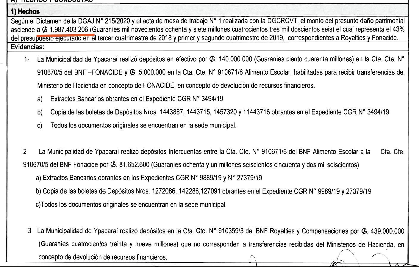 El perjuicio patrimonial detectado por la CGR asciende a exactamente G. 1.987.403.206 y corresponden al 43 % del presupuesto ejecutado en el tercer cuatrimestre de 2018 y al primer y segundo cuatrimestre de 2019, de los fondos provenientes de royalties y Fonacide.