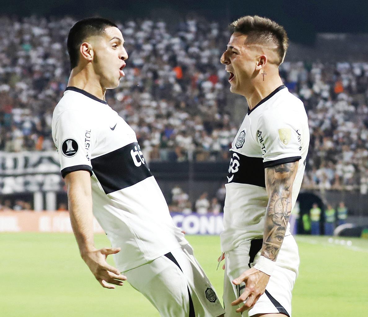 Guillermo Paiva, la figura del partido con su doblete, festeja uno de sus goles con el defensor Luis Zárate, en una noche inspirada de Olimpia