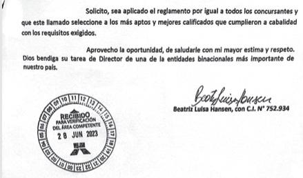 Al respecto, la señora Beatriz Hansen, madre del denunciante, presentó una nota el pasado 28 de junio ante la superintendencia de Recursos Humanos de la binacional, a cargo del superintendente Claudio Garcete, en la que expone dicha situación y solicita que se apliquen las normas y que el llamado “seleccione a los más aptos y mejores