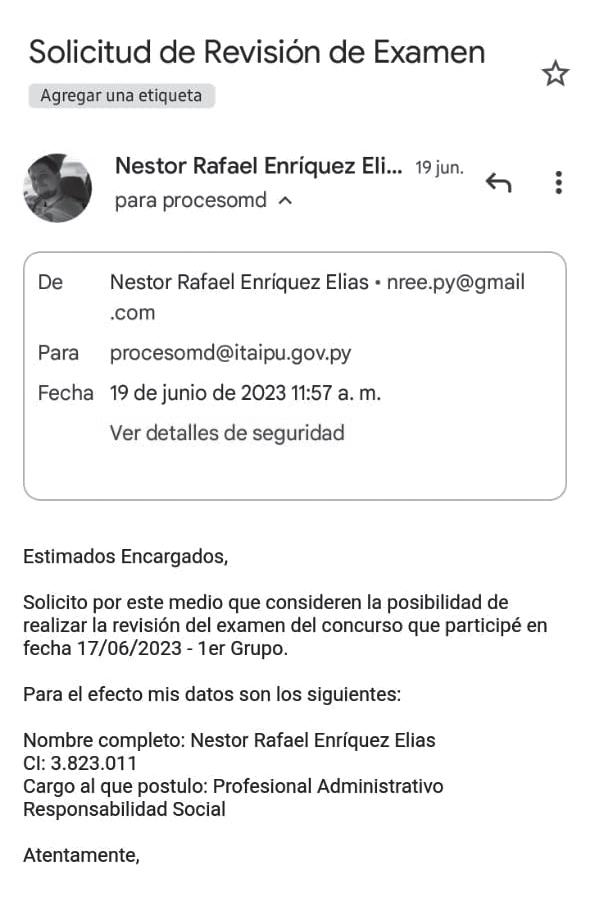 Vale recordar que tal como ocurrió con la solicitud de Arza, otros aspirantes como Néstor Enríquez y Claudia Spinzi también protestaron y requirieron revisión de sus exámenes, pero fueron ignorados por Itaipú.