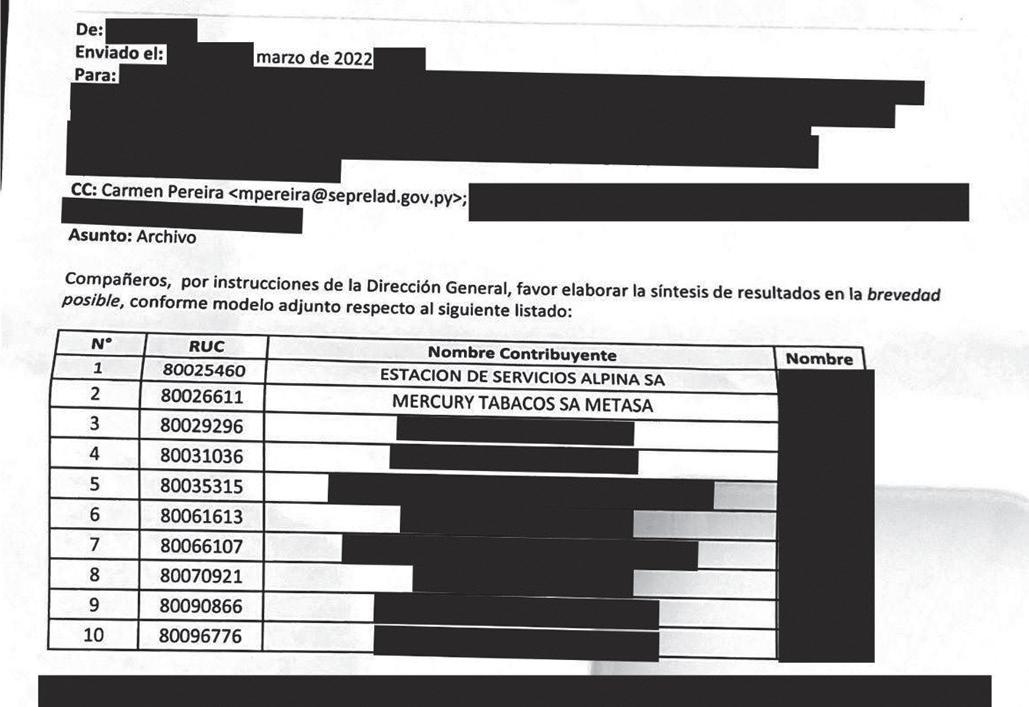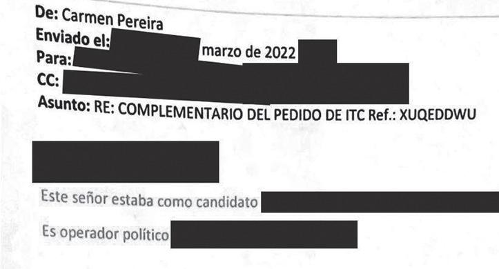 La funcionaria encargada de operativizar la elaboración de estos informes y filtrarlos a la prensa era la viceministra Carmen Pereira y el séquito de funcionarios que responden a sus órdenes. “La caja negra” tuvo acceso a registros de correos electrónicos entre el 5 y el 7 de marzo de 2022 enviados por Pereira a sus funcionarios leales en que se observaban las “instrucciones” que daba para investigar a una lista de personas físicas y jurídicas vinculadas a referentes de Honor Colorado y en que solicitaba la elaboración de informes especiales sin el respaldo correspondiente.