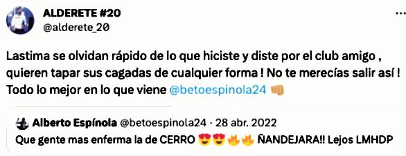 “Lástima, se olvidan rápido de lo que hiciste y diste por el club, amigo. Quieren tapar sus cagadas de cualquier forma. No merecías salir así, todo lo mejor en lo que viene”, escribió en Twitter el defensor central del Getafe español, adjunto un posteo en el que Espínola resaltaba la pasión de los hinchas azulgranas.