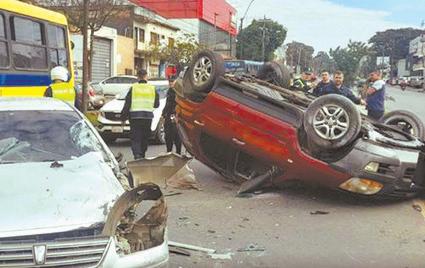 Ayer se produjo un accidente de tránsito que involucró a cuatro vehículos, entre ellos a una unidad del transporte público. Ocurrió en la avenida Eusebio Ayala y Boggiani. Afortunadamente, no hubo heridos graves, aunque el automóvil que aparentemente protagonizó el percance quedó volcado, pero sus ocupantes salieron ilesos.