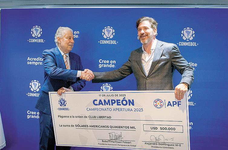 La Conmebol entregó al club Libertad los 500 mil dólares por lograr el título de campeón del torneo Apertura 2023 de Paraguay. El presidente de la Conmebol Alejandro Domínguez (derecha) comandó la ceremonia simbólica junto al titular de Libertad Rubén Di Tore.