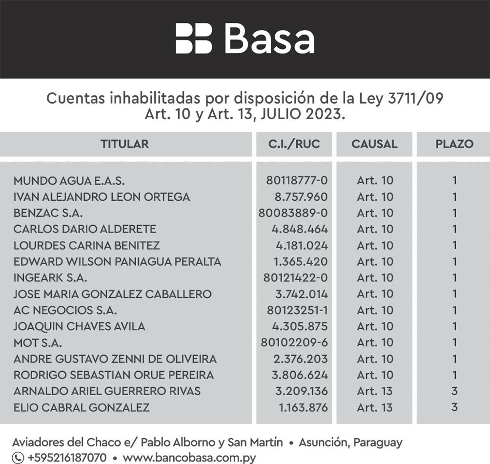 Un grupo mayoritario de 39 presidentes de comités del departamento Central, de un total de 53 referentes, presentó un comunicado en el cual expresan su pedido urgente de renuncia de Efraín Alegre como titular del PLRA o su destitución del cargo por parte de los convencionales. P. 2